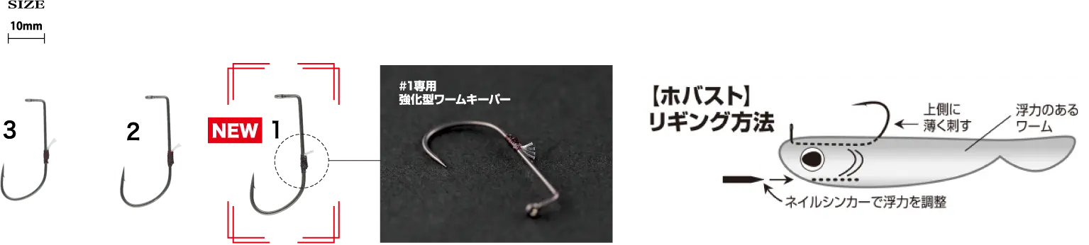 The Ryugi Hover Shot Strolling hook is based on the hook of the jig head "Vespa", we have reviewed its strength and balance. A special worm keeper is used on the main body, so it keeps the silhouette even with worms that tend to slip out of place, and demonstrates high keeping power.