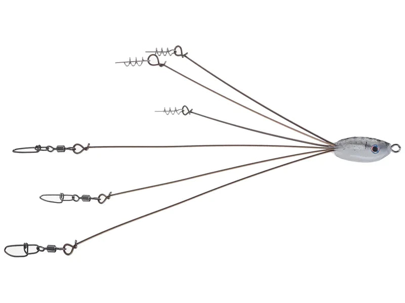 Fitted with top quality hardware, the Hog Farmer Baits Tactical Bassin Mini Flex Rig 4 Blade comes with premium ball bearing swivels attached to super bright willow blades, center pin screw locks for teasers, 80lb snap swivels for hooked baits, and includes three split rings in the package if anglers prefer to run split rings on hooked baits instead of snaps. The impact-resistant polymer head provides superior durability and features an embedded swiveling line tie to reduce line twists. Simply add your favorite jig heads and swimbaits and the Hog Farmer Baits Tactical Bassin Mini Flex Rig 4 Blade will come to life.