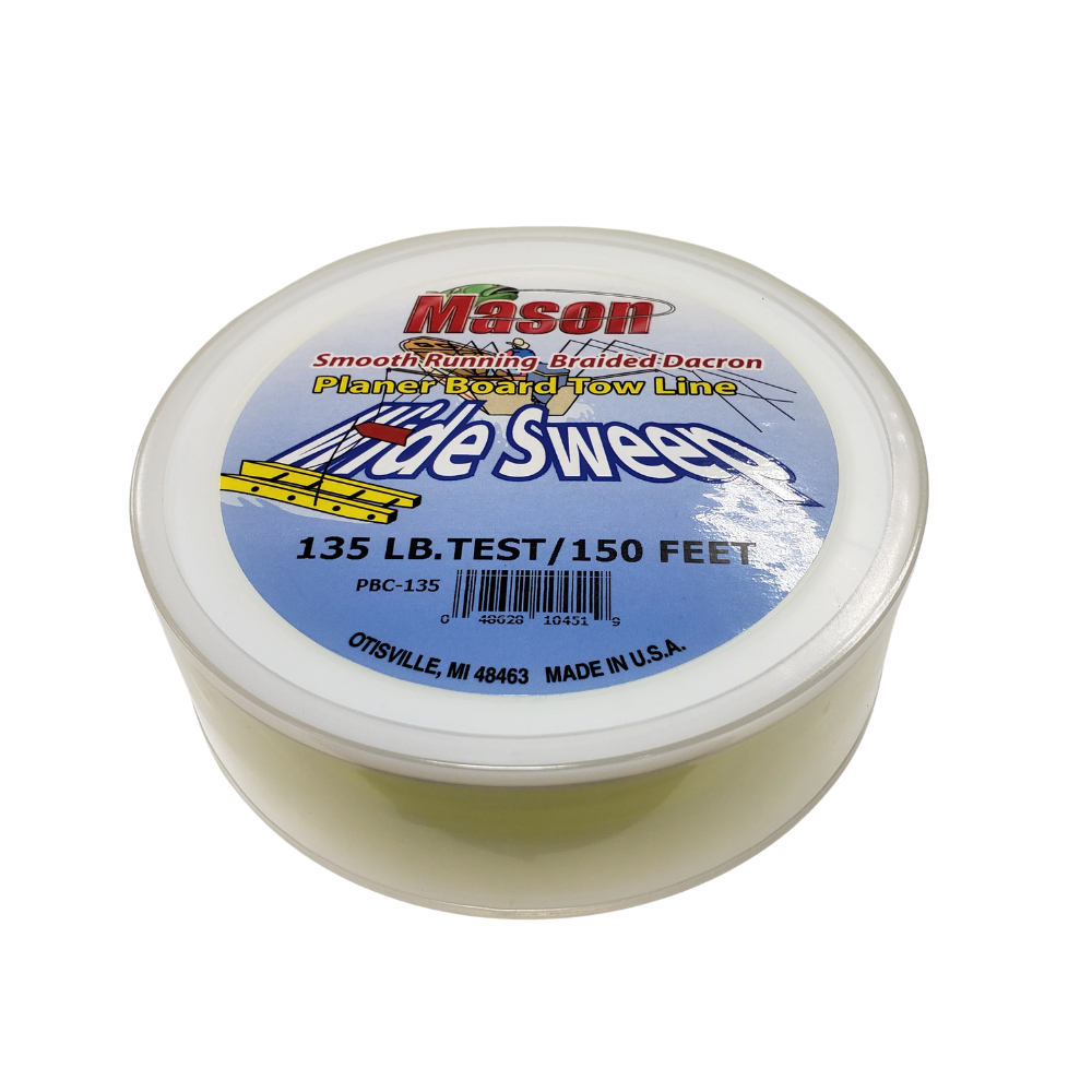 "WIDE SWEEP" Planer Board Tow Line. Made of high visibility fluorescent braided dacron line. This line is low stretch, abrasion resistant and resists water absorption!