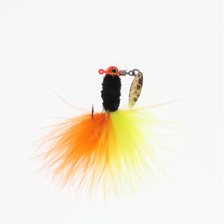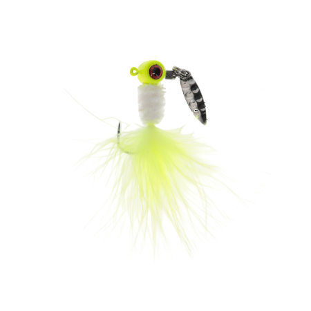 Strike King’s Mr. Crappie Marabou Sausage Spin is a crappie jig featuring a silver 3/4-inch hammered willow leaf blade that spins when retrieved or jigged vertically. The jig head is pre-rigged with a Marabou Jig with a tail that fans out and pulsates in a life-like manner as the lure moves through the water. Built with distinct, eye-popping colors and explosive designs that entice fish and attract more strikes
