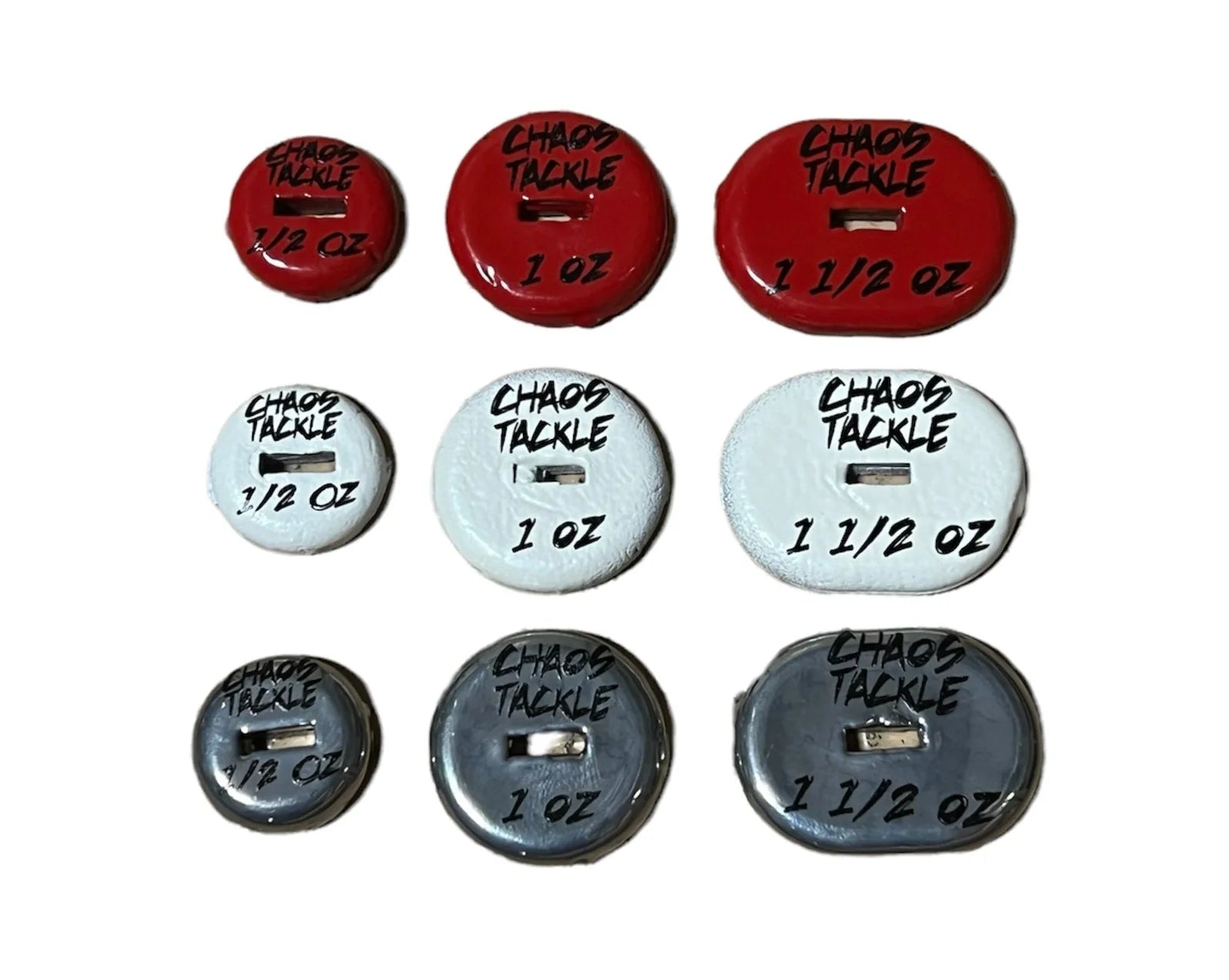 The Deep Threat is a very simple to use, yet highly effective way to add extra weight to a Medussa and many other lures. These weights will allow you to work your bails deeper and stay in the strike zone longer while fishing over deep structure or open water. Available in 3 different weights ( 1/2 oz, 1 oz, 1 1/2 oz) to offer you the angler, the ultimate depth control and the ability to key in on the exact depths you want to fish. Simply detach the front or back split ring and hook from your Medussa, slide the "Deep Threat" over the hook hanger and reattach the split ring and hook. It's that simple. The "Deep Threat" will help every angler put more and larger fish in the boat by getting your Medussa down there it needs to be throughout the year. Get DEEP and get BIT with Deep Threat from Chaos Tackle.