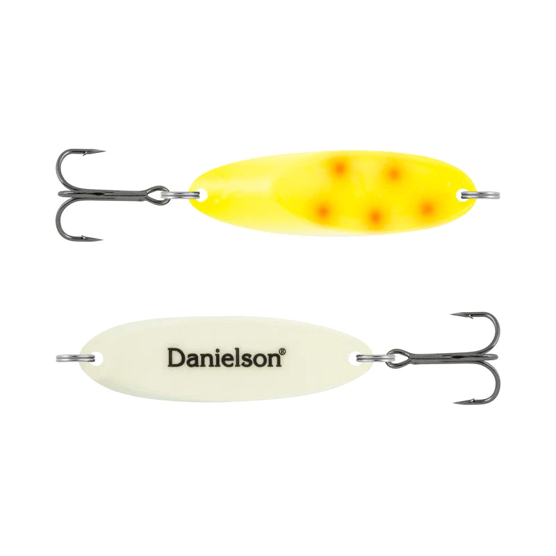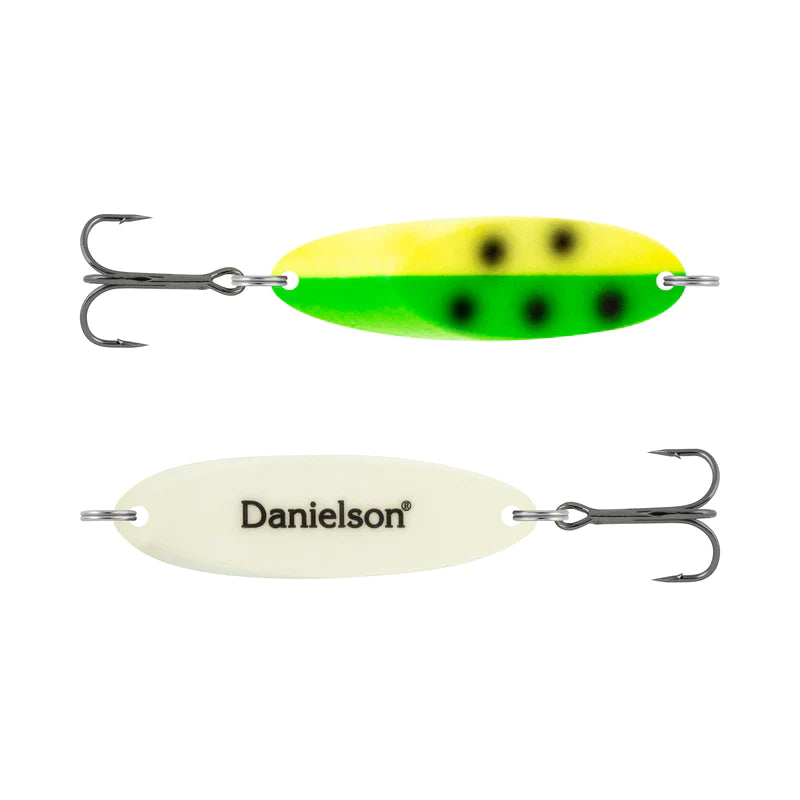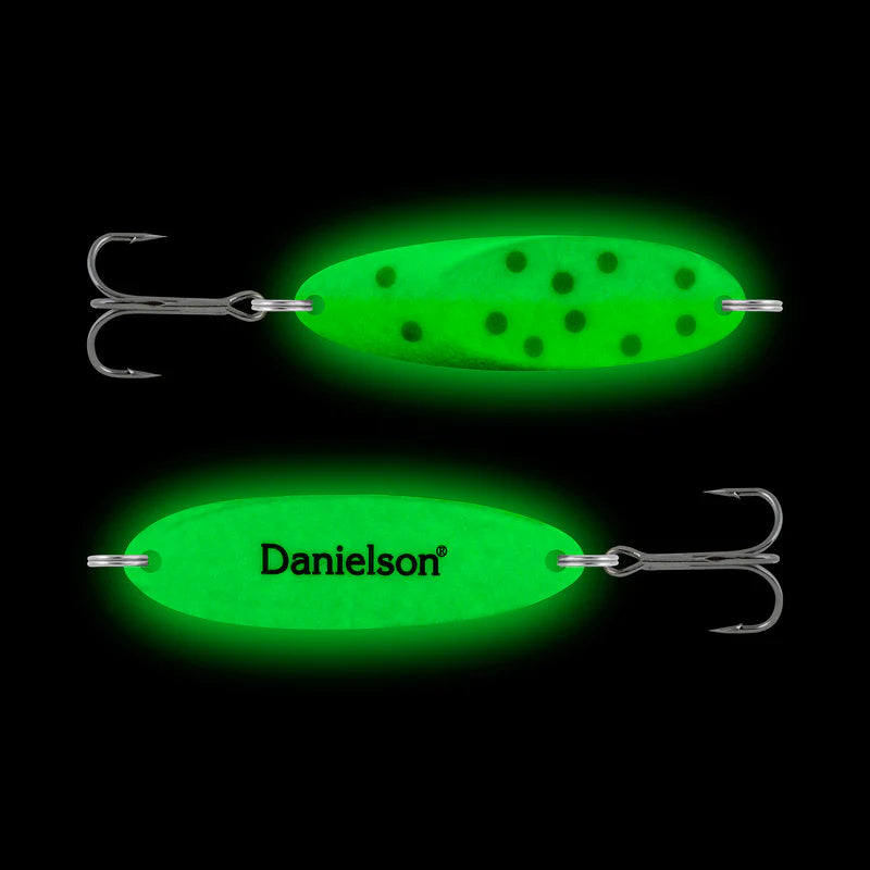Built to dominate Salmon, Trout and other nocturnal predators. These spoons have full super glow premium paint on the front and back for maximum visibility. Spoons are fully seal coated for maximum durability. 100% brass and built to cast long and retrieve deep. Premium super sharp Danielson hooks for successful hookups.