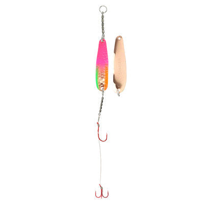 This setup is crafted with a 13-pound test coated wire that's expertly snelled and crimped, featuring sturdy VMC hooks to ensure reliability and durability. The design allows for faster trolling without sacrificing the lure's enticing motion or effectiveness, proven to captivate target fish with its dual-action appeal.