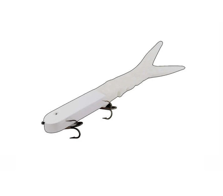 A unique hybrid jerk bait, the Dyin Dawg by Musky Innovations is designed with a solid hard plastic front half while the back half is a replaceable soft plastic tail.
