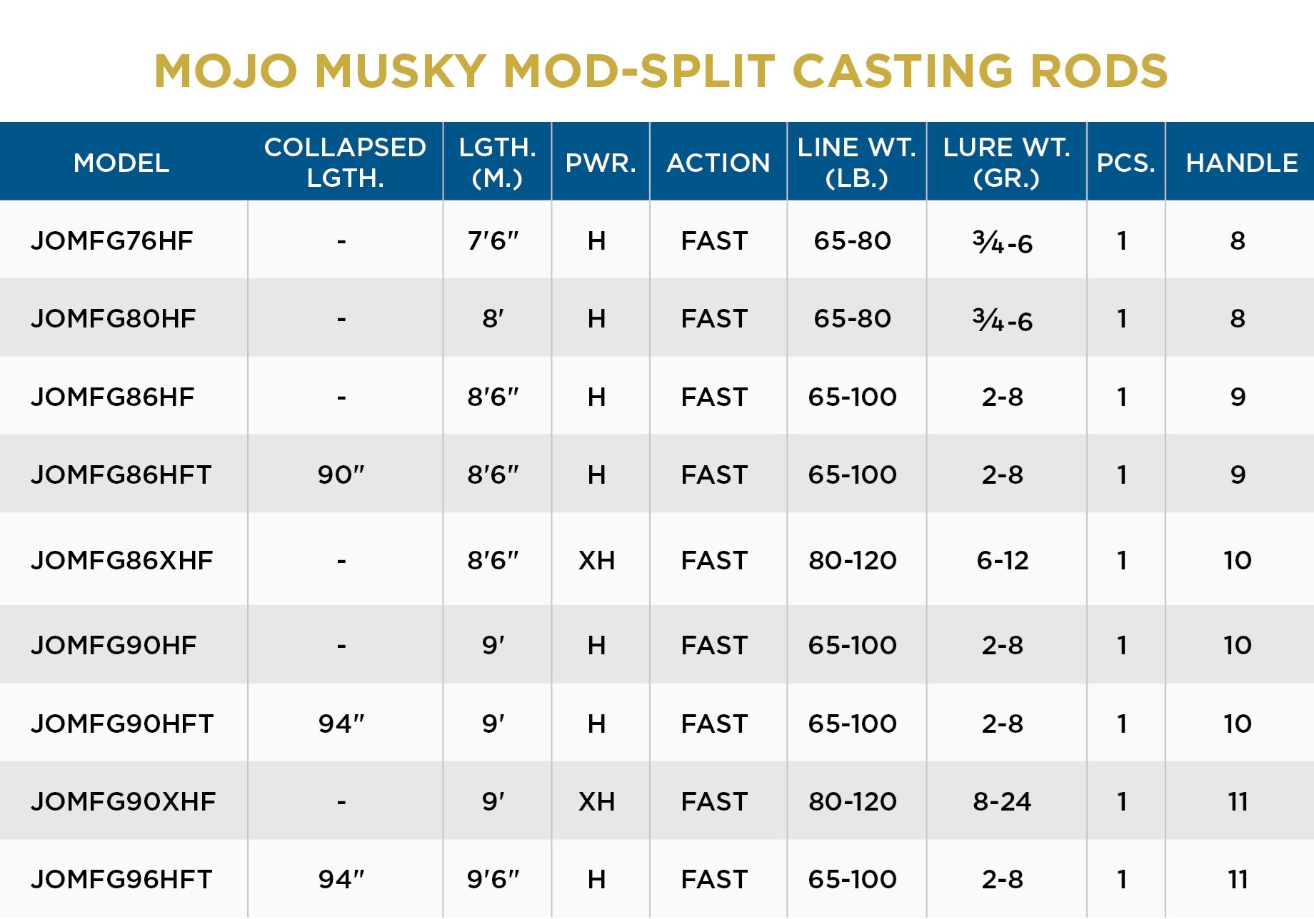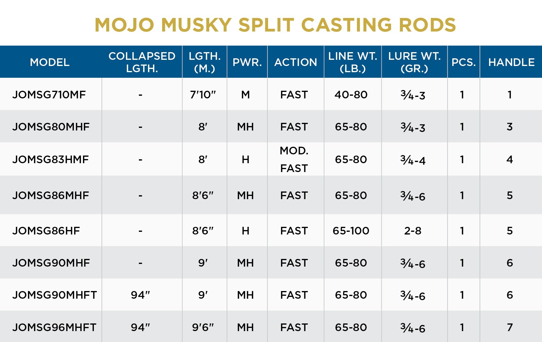 Next-generation Mojo Musky rods are conceived for musky anglers who want to fish longer, smarter, and more effectively in any presentation with pioneering ergonomics and adaptability; diversified lengths, powers, and actions; and proven, angler-preferred blank construction.