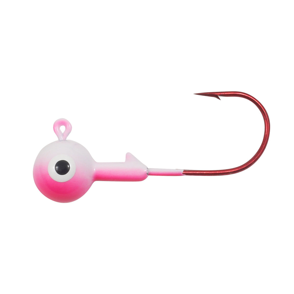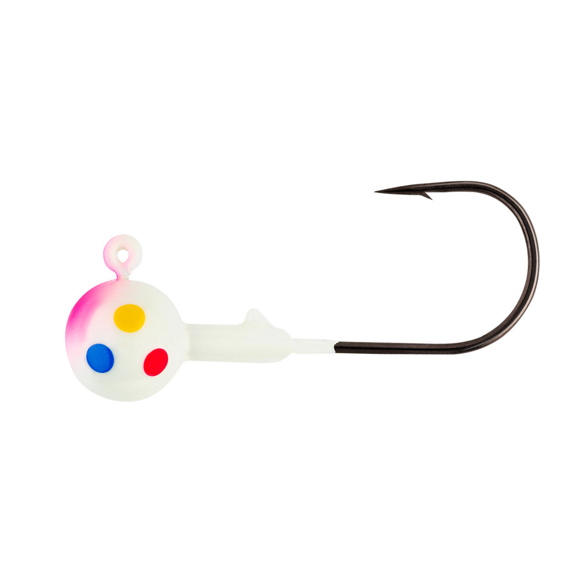 The classic round head jig. Featuring super-sharp hooks, molded bait keeper and appropriately sized eyelets. The Gum-Ball® Jig comes in 22 colors and 8 sizes, so you can have a Gum-Ball®Jig for every situation. Its lead jig collar provides balance to the jig and holds onto soft plastics and live bait. They feature blood red and black nickel hooks that are custom designed so the tie eye fits flush with the head. Sizes 3/16 - 1/2 use a +1 size larger hook making them perfect for larger predator fish like walleyes.