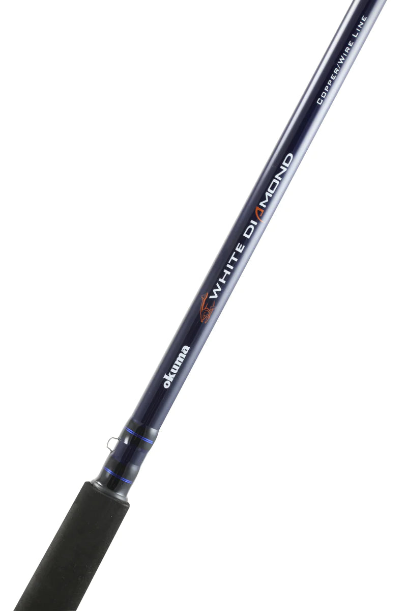 Okuma White Diamond Trolling Rods utilize carbon and glass blank construction for maximum durability. These rods feature low-profile, stainless-steel guide frames and inserts with welded stainless-steel guides. Okuma White Diamond Trolling Rods designated with WL in the model number feature a convenient swivel roller on the tip-top. Cushioned stainless-steel hooded reel seats will help to keep your reels in position, while triangular-shaped EVA foregrips provide all-day comfort.