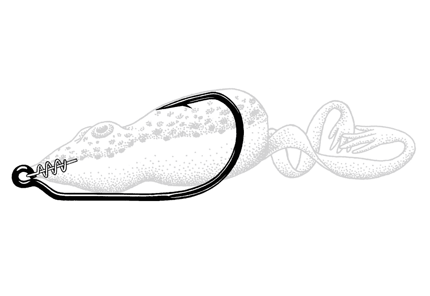 This bass hook is Unique with its TwistLOCK™ Centering-Pin Spring (Patented) attached to the hook eye. Baits can be permanently secured by inserting the pin in the center of the nose of a soft plastic, which can then be twisted (screwed) onto the TwistLOCK™ coil spring so that any bait will rig perfectly everytime! The hook'sopen gap allows for more positive and effective hook sets. Ideal for weedless-style Carolina Rig'n and Texas Rig'n of big tube baits and beefy soft plastics. Features include a 30°eye-bend, XXX-strong forged shank, Super Needle Point, and black chrome finish.