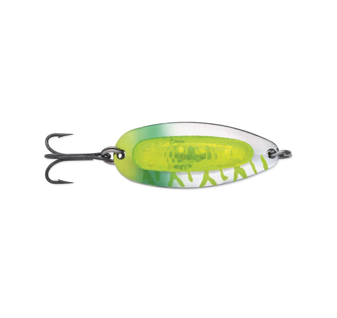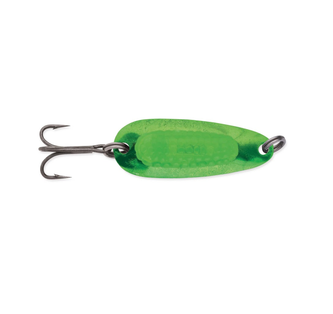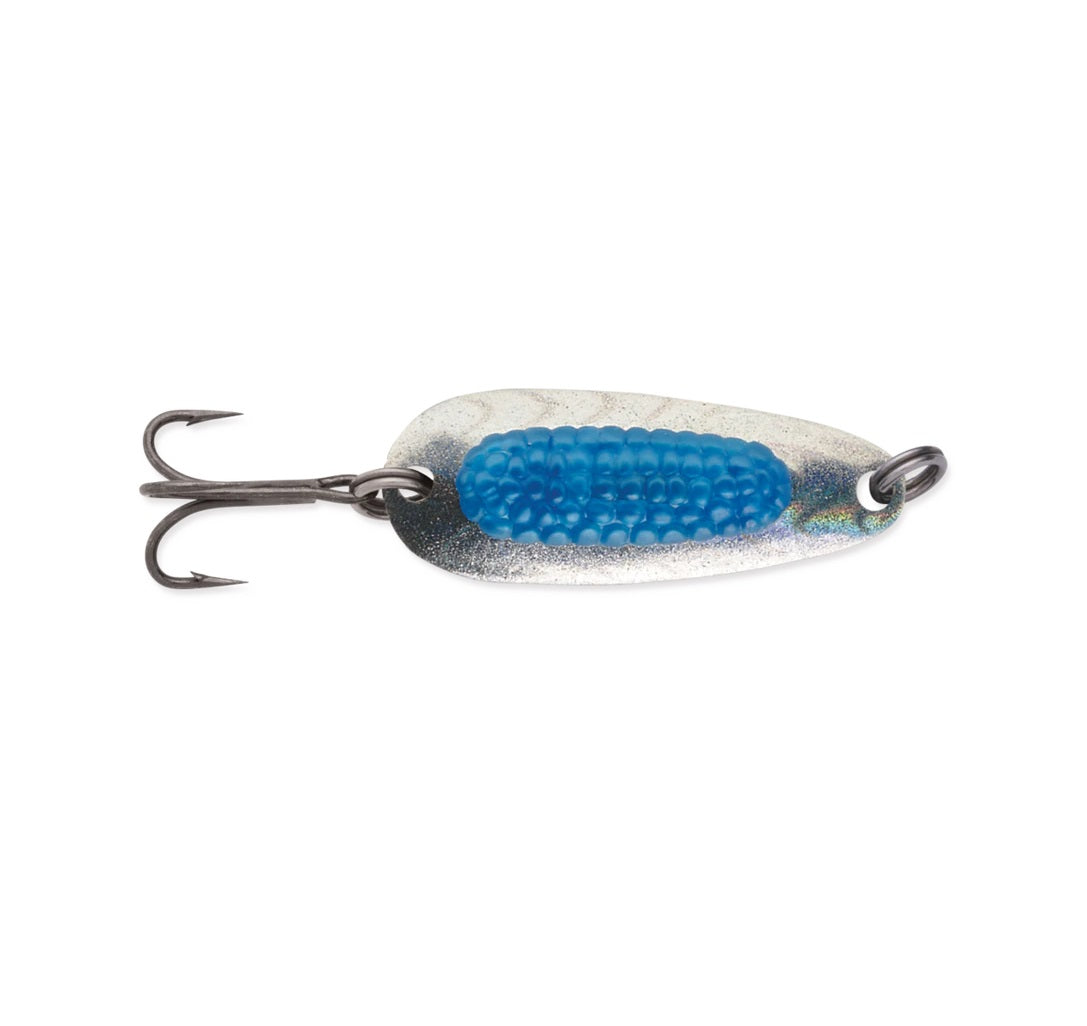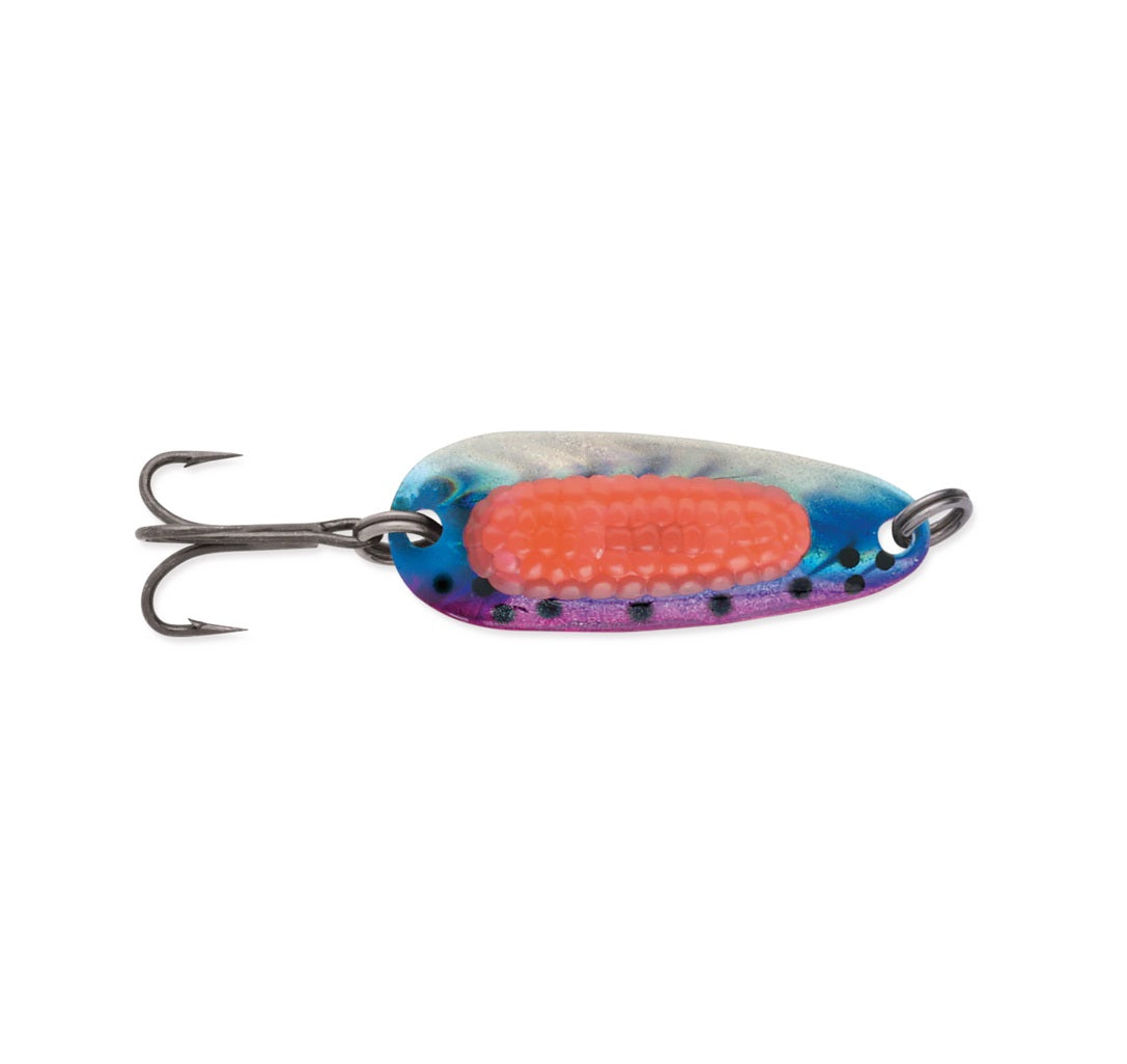 The Pixee® Spoon features heavy construction that permits incredibly long casts and deep retrieves even in fast moving water. Egg sac insert adds natural element that drives fish wild. Plated brass with a hammered finish reflects more light increasing flash. Finished with premium VMC black nickel hook. Each spoon includes a matched siwash hook. Considered "Precious Metal" in Alaska