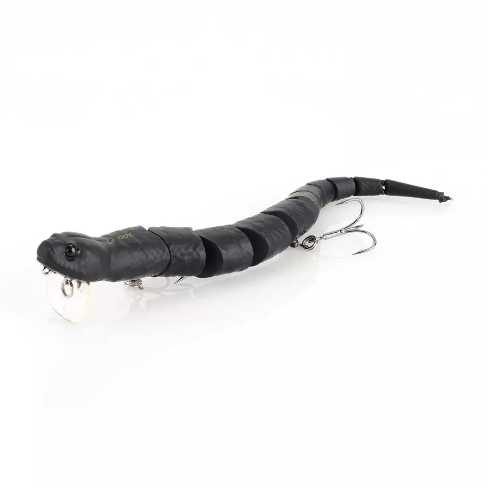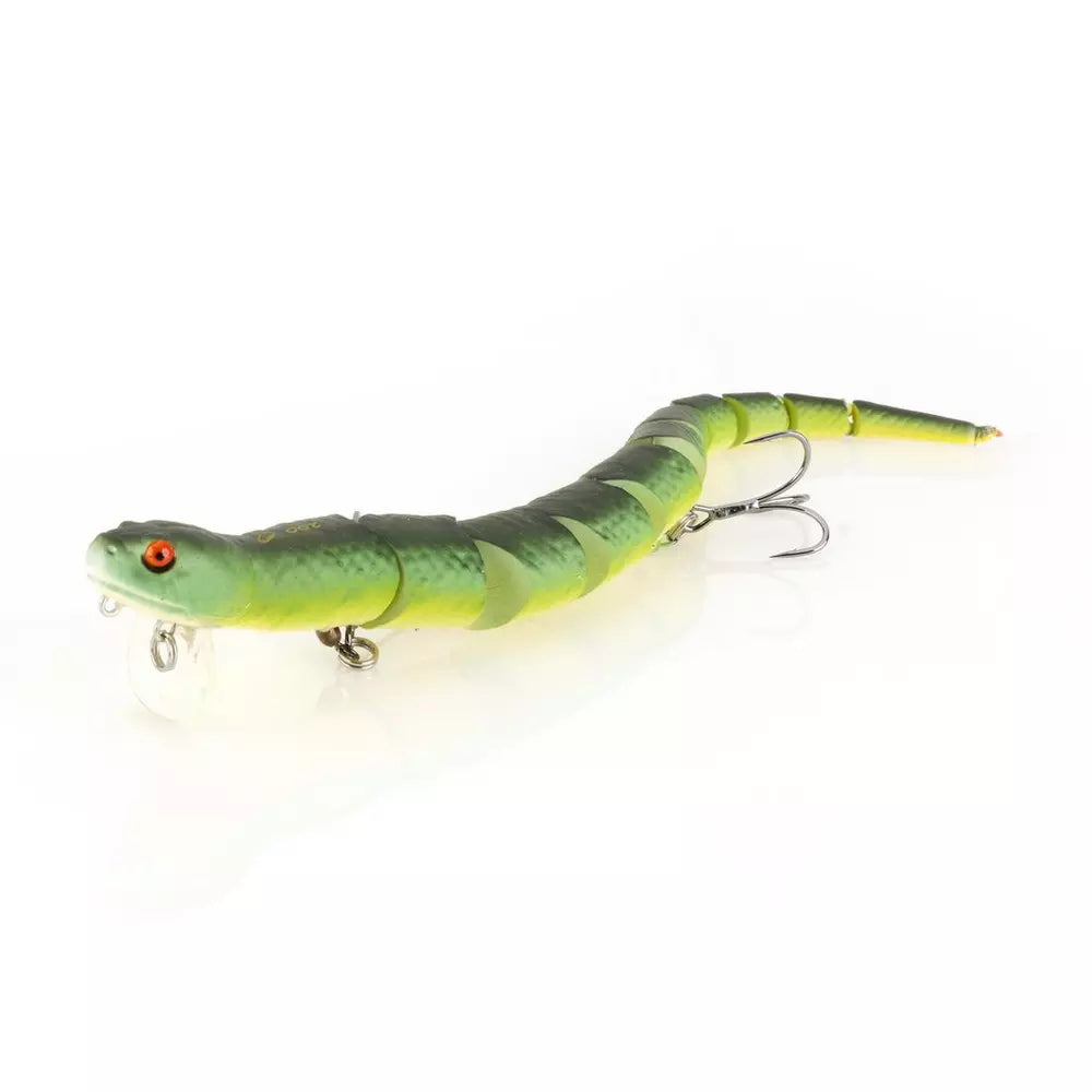 Based on a scan of a real snake. The perfect baby snake imitation, with the most realistic swimming topwater action. The lure swims with a wide S action either on the surface or just below, depending on where you attached the line to the lure.