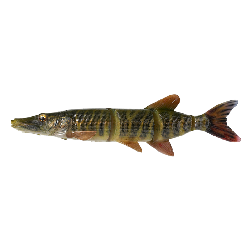 Based on a 3D scan of a real baby pike with perfect details, Photo Chrome skin print and added DNA scent. Small jack pikes are the favorite prey for big pike at certain times of year, and these super realistic lures will be deadly when that time comes. The lure swims with the most realistic s-curve action, and sinks slowly on spin-stop. Created with our brilliant Line Thru design, the lure will slide up the trace away from shredding teeth, meaning pike cannot use the weight of the big lure to throw the hook.