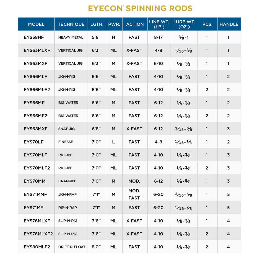 - Technique-specific walleye series designed for superior performance utilizing custom handle configurations, unique to each model, for angler comfort and functionality