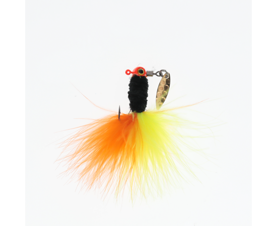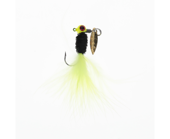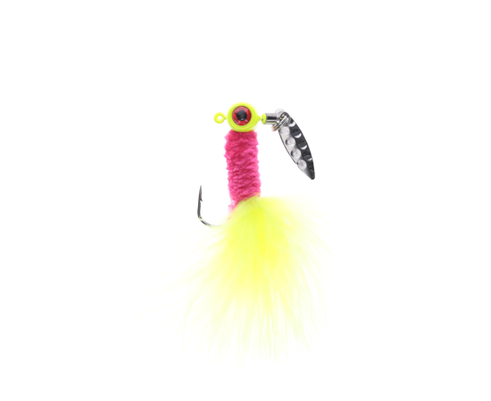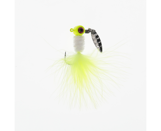 Strike King’s Mr. Crappie Marabou Sausage Spin is a crappie jig featuring a silver 3/4-inch hammered willow leaf blade that spins when retrieved or jigged vertically. The jig head is pre-rigged with a Marabou Jig with a tail that fans out and pulsates in a life-like manner as the lure moves through the water. Built with distinct, eye-popping colors and explosive designs that entice fish and attract more strikes