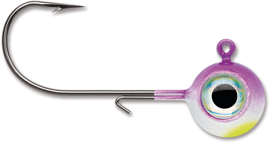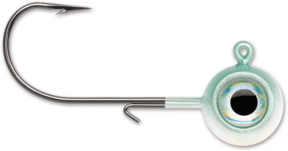 This VMC® upgraded version of the traditional Aspirin-shaped heads provides added control. 3-D holographic eyes create the illusion of a wider profile while adding realism. Assembled with a VMC® Premium high-carbon steel hook with top of the line black nickel finish. The wide range of colors includes UV Bright finish colors that guarantee you to catch more fish in all water conditions