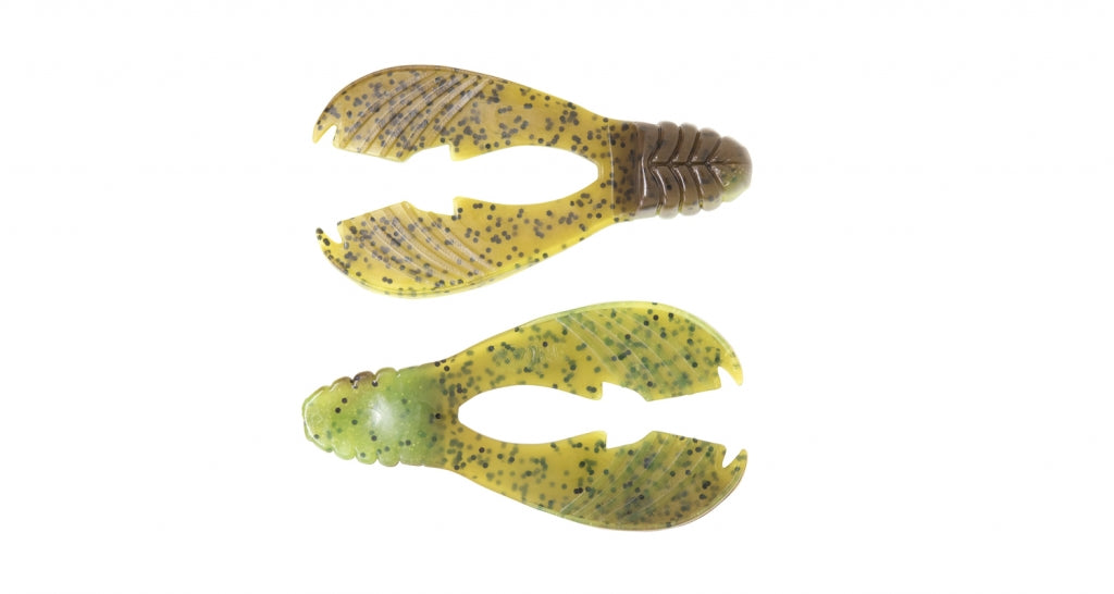 The X Zone Muscle Back Chunk (formally Rebel Chunk) has soft, realistic, textured claws are ribbed on both sides and the outer edges having specially cupped pinchers that taper down to join the body. The specialized plastic, super fine salt and scent infused formula used to make the Muscle Back Chunk allows the claws to float at rest for a time mimicking the defensive stance of a real crayfish and vibration that BASS LOVE!!!