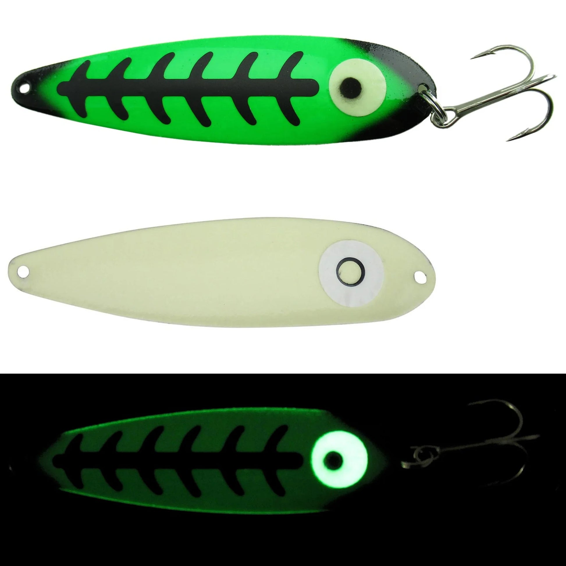 The Moonshine Lures Trolling Spoons are some of the brightest glowing lures that you'll find on the market today! After being exposed to natural or UV light, these spoons will be glowing for hours on end. That impressive glow is perfect for drawing in the attention of predators. Moonshine Standard Trolling Spoons are also ideal for being fished during the day as they are highly UV-reflective. Ideal for catching salmon, trout, walleye, pike, muskie, and striper, these spoons are sure to please even the pickiest angler.