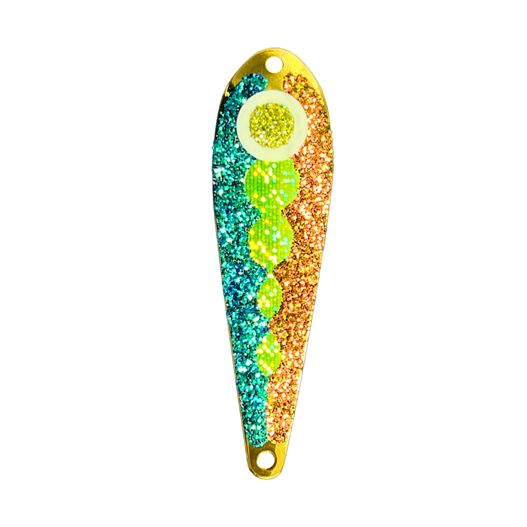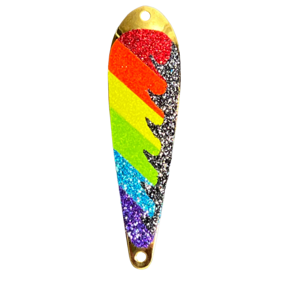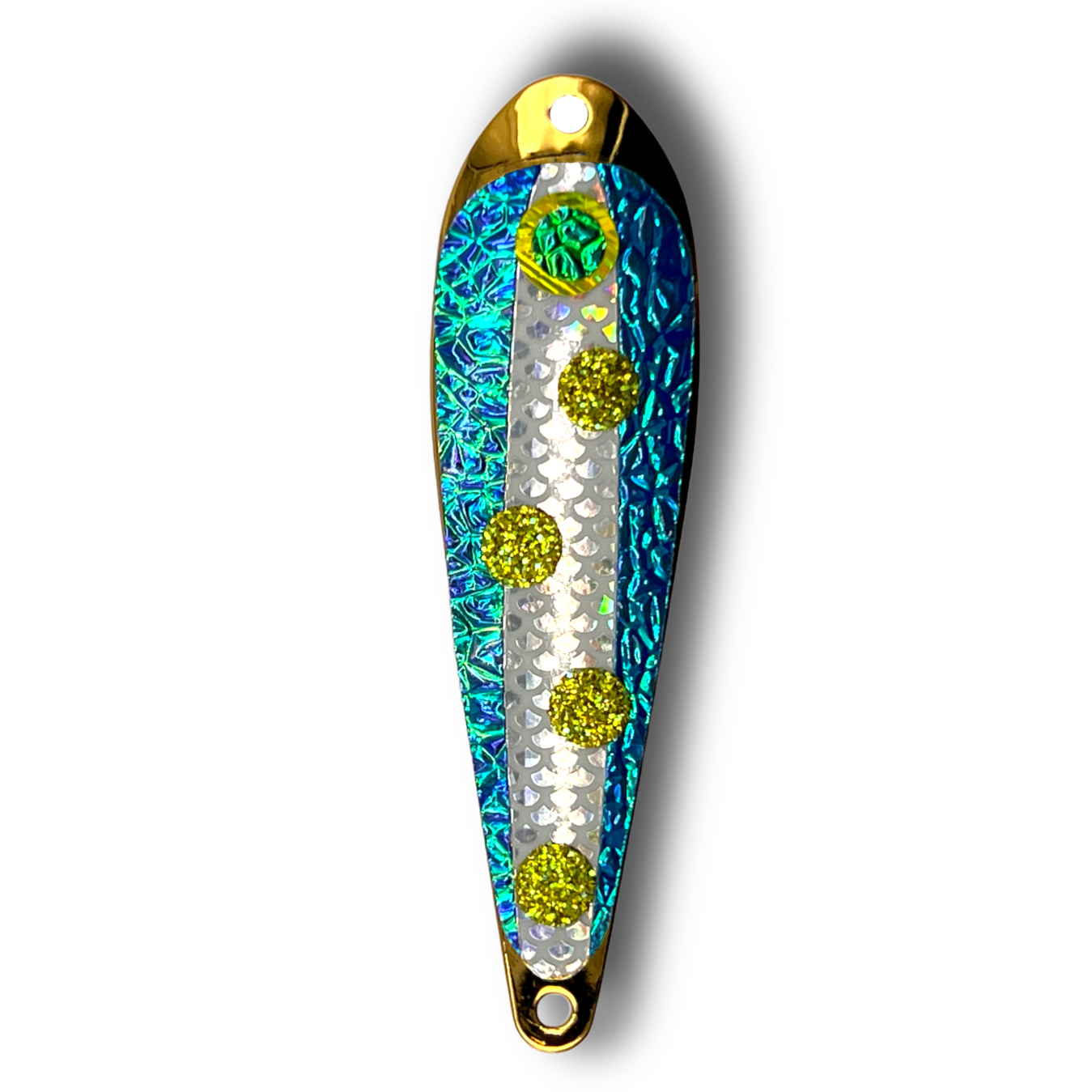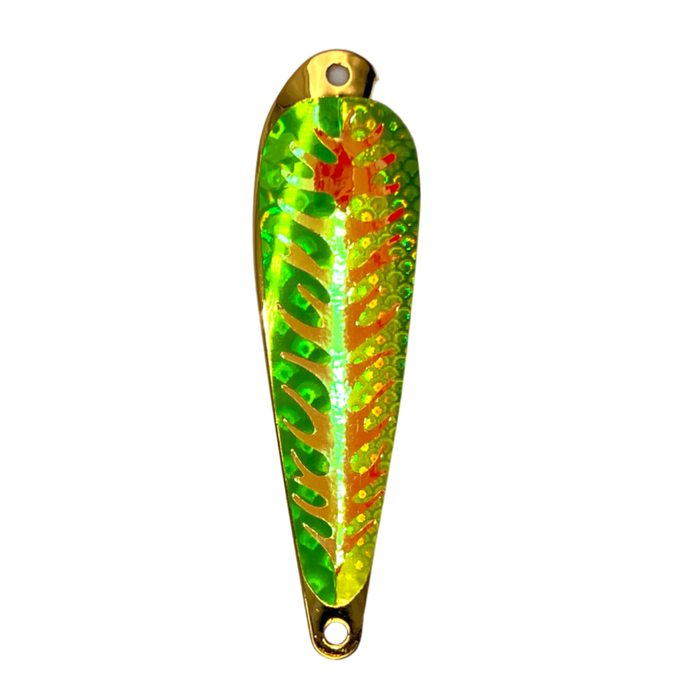 Clear coated brass, high performing, elongated teardrop-shaped spoons with top quality holographic, super glow and/or UV tapes in our hottest hitting colour combinations.