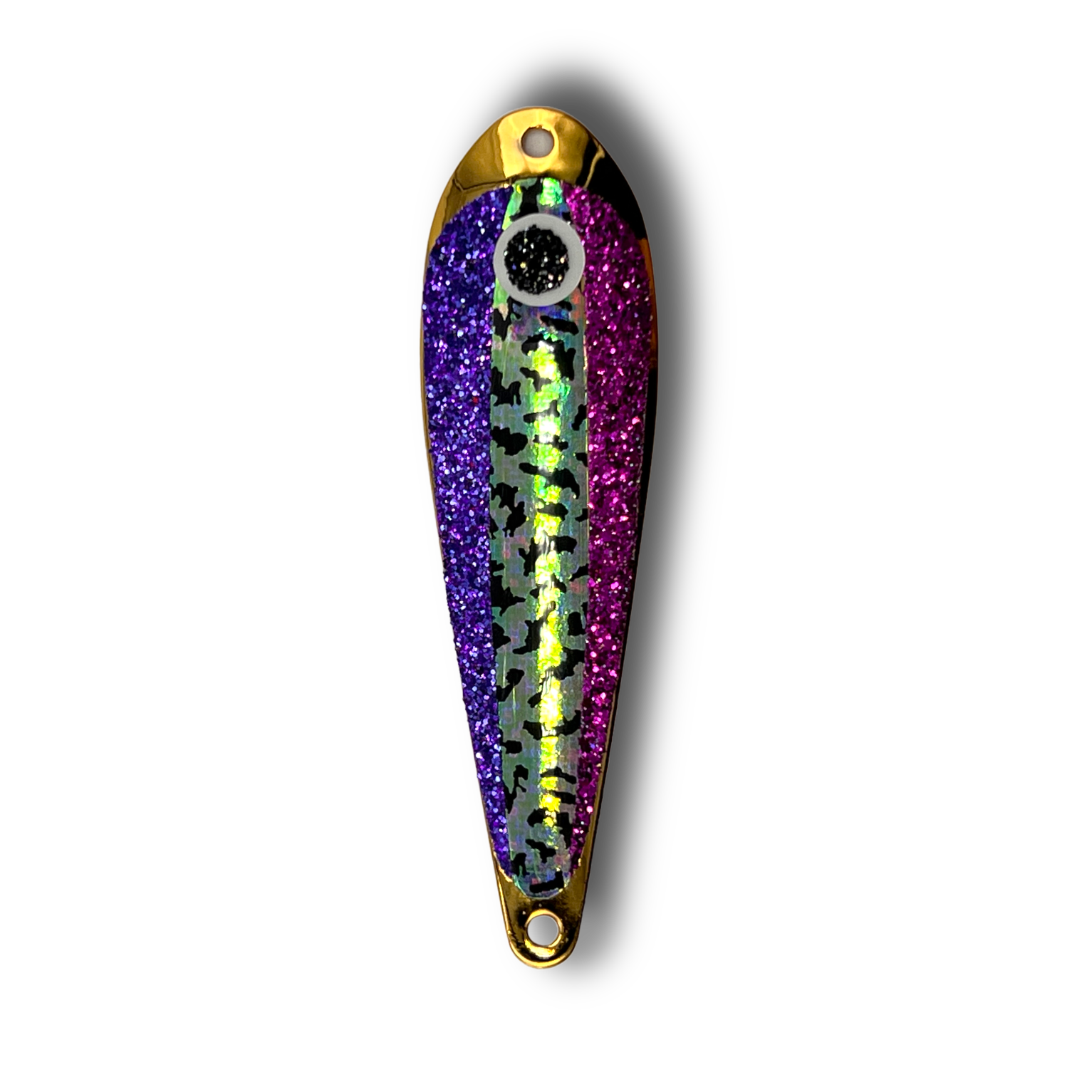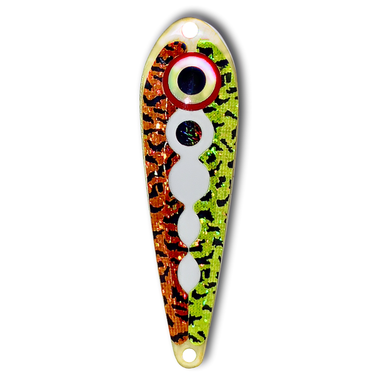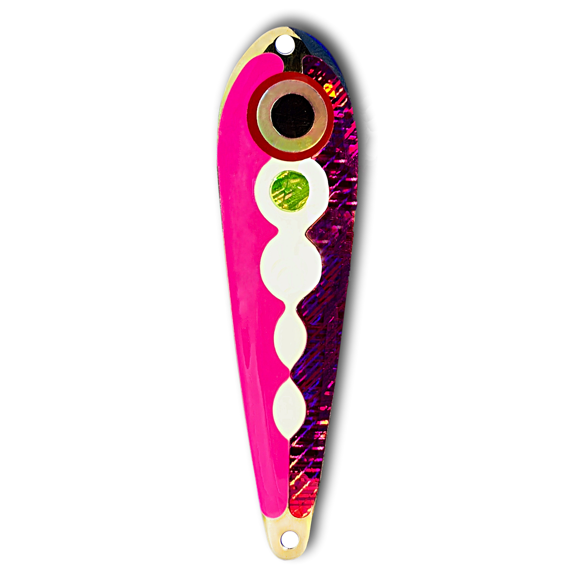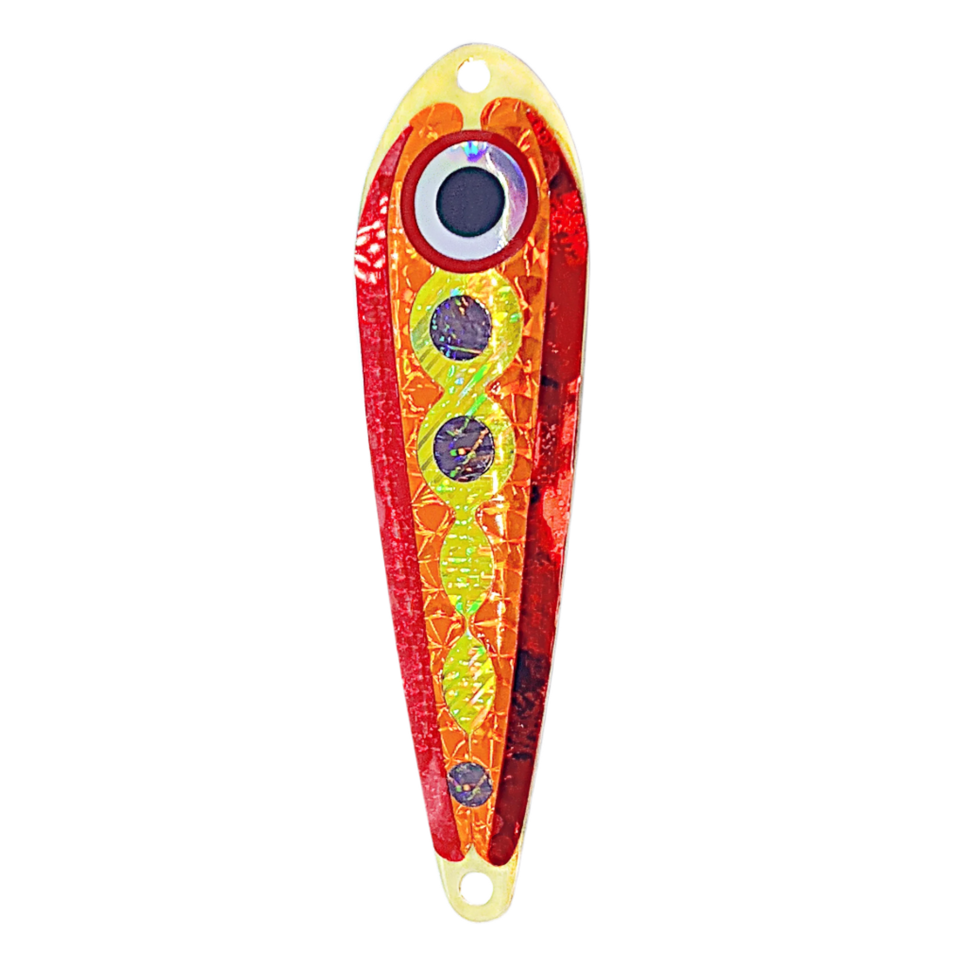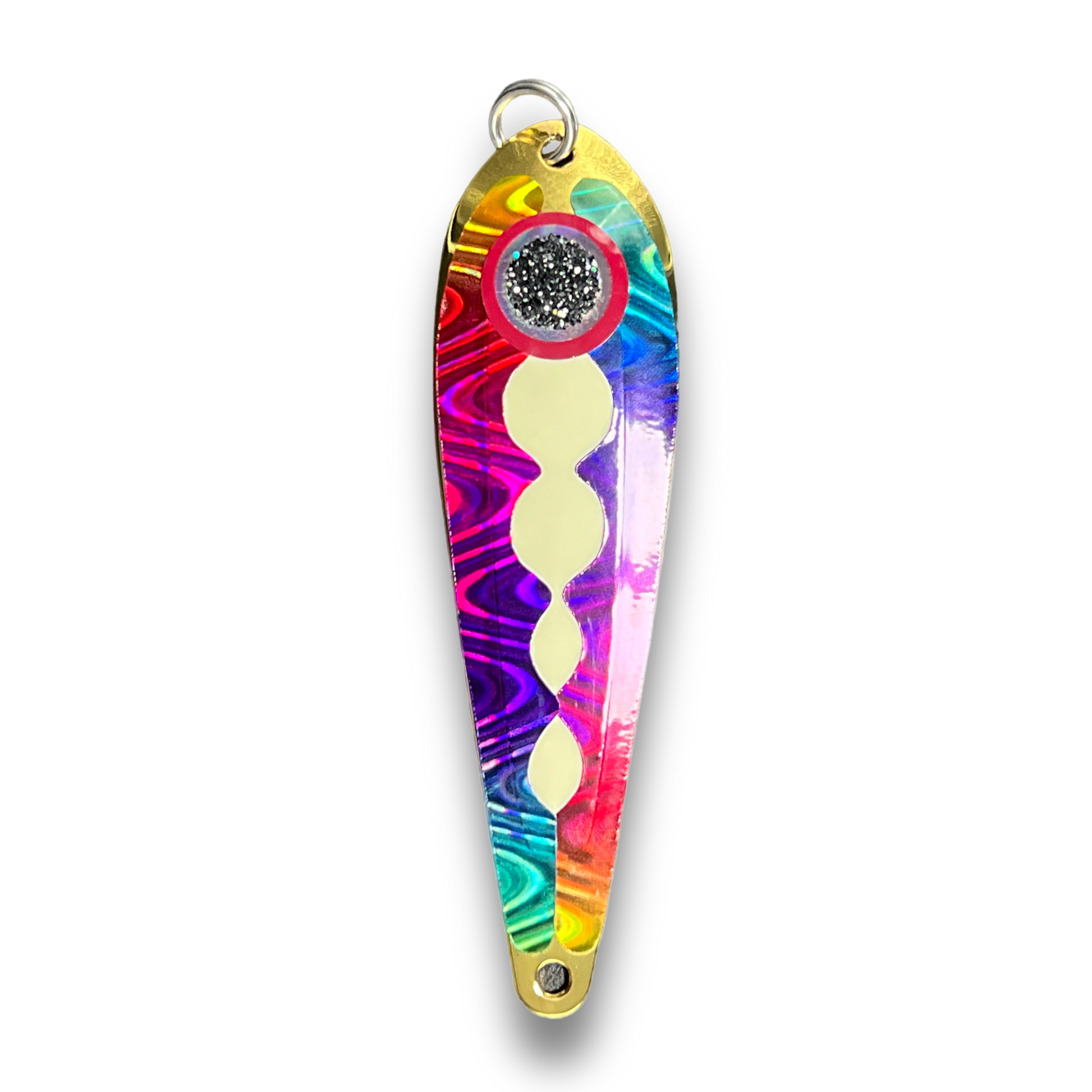 Clear coated brass, high performing, elongated teardrop-shaped spoons with top quality holographic, super glow and/or UV tapes in our hottest hitting colour combinations.