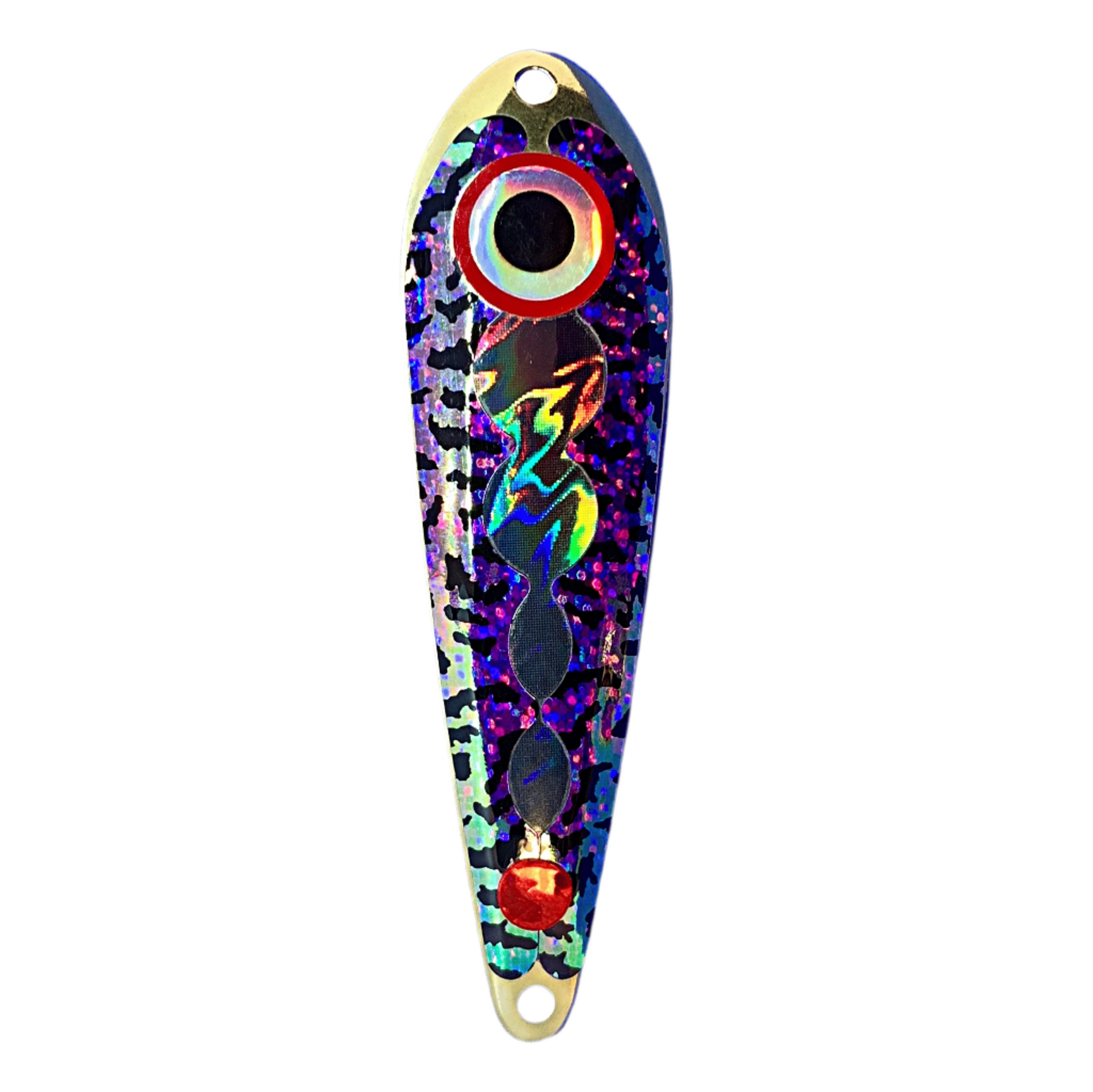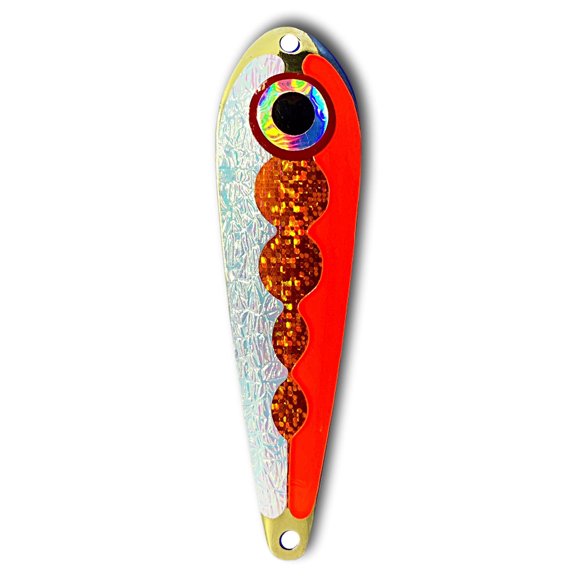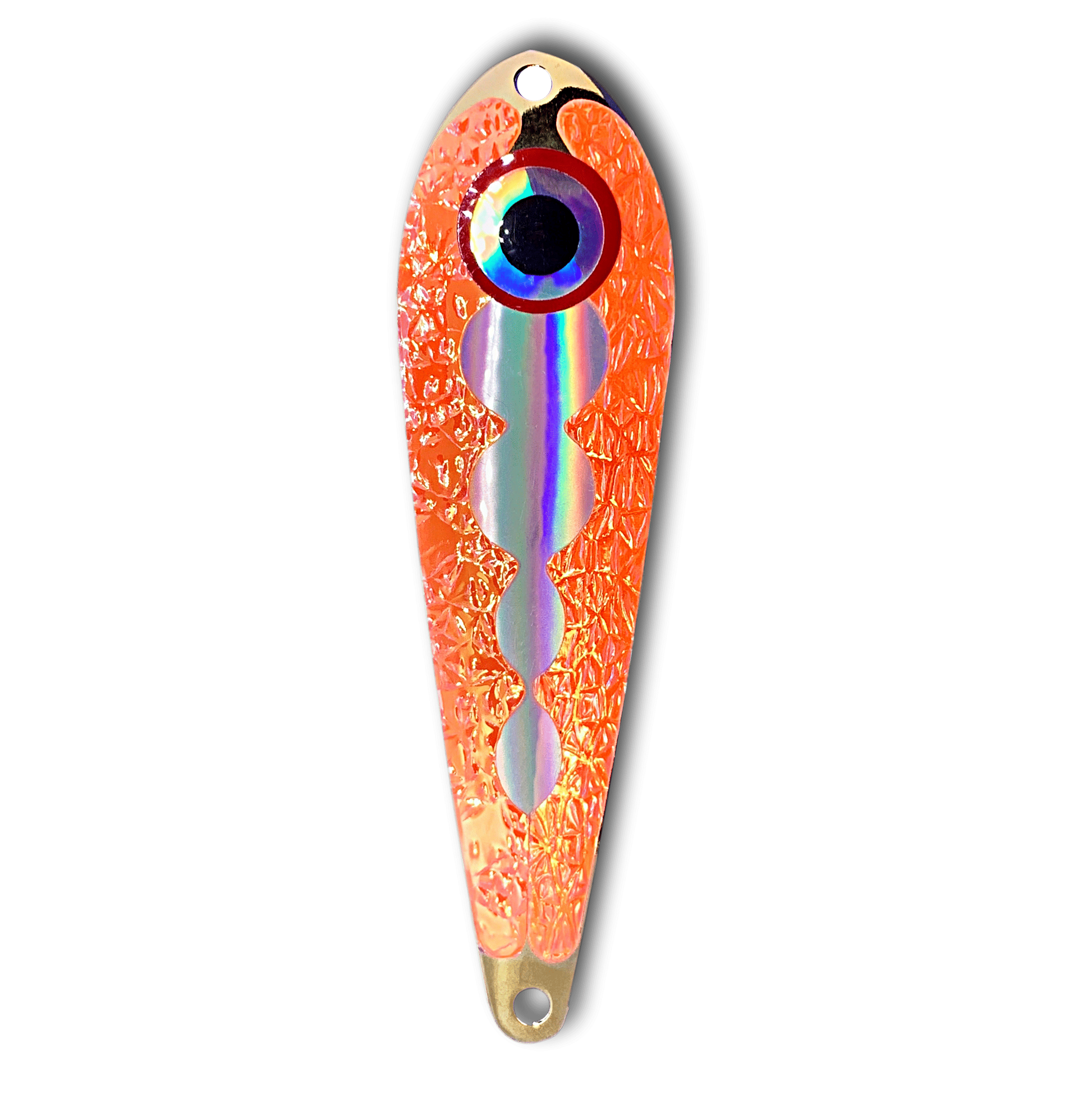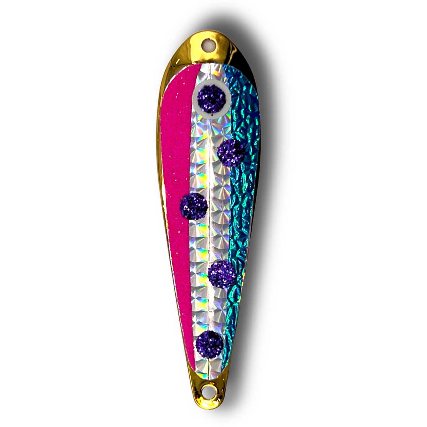 Clear coated brass, high performing, elongated teardrop-shaped spoons with top quality holographic, super glow and/or UV tapes in our hottest hitting colour combinations.