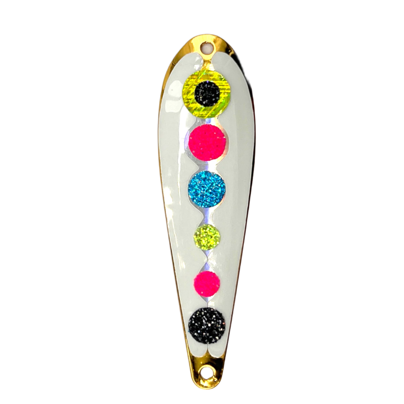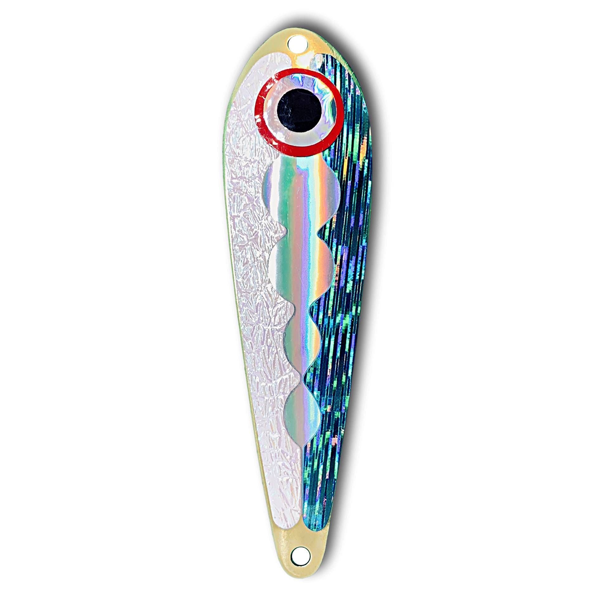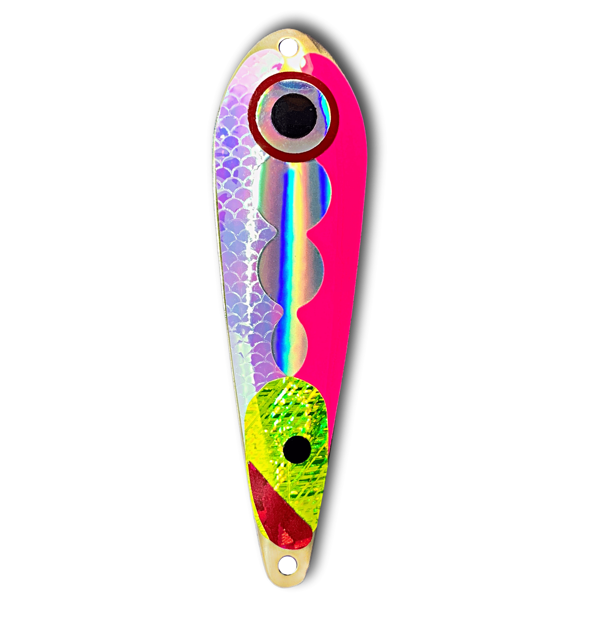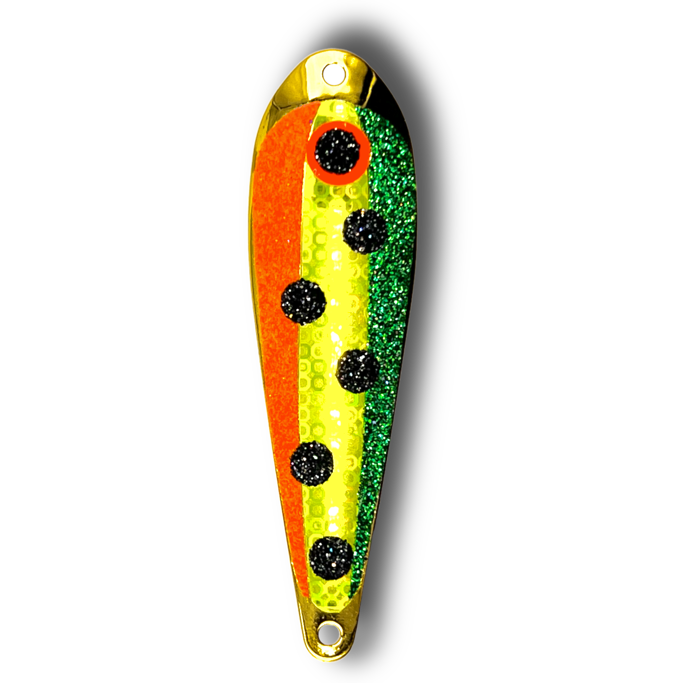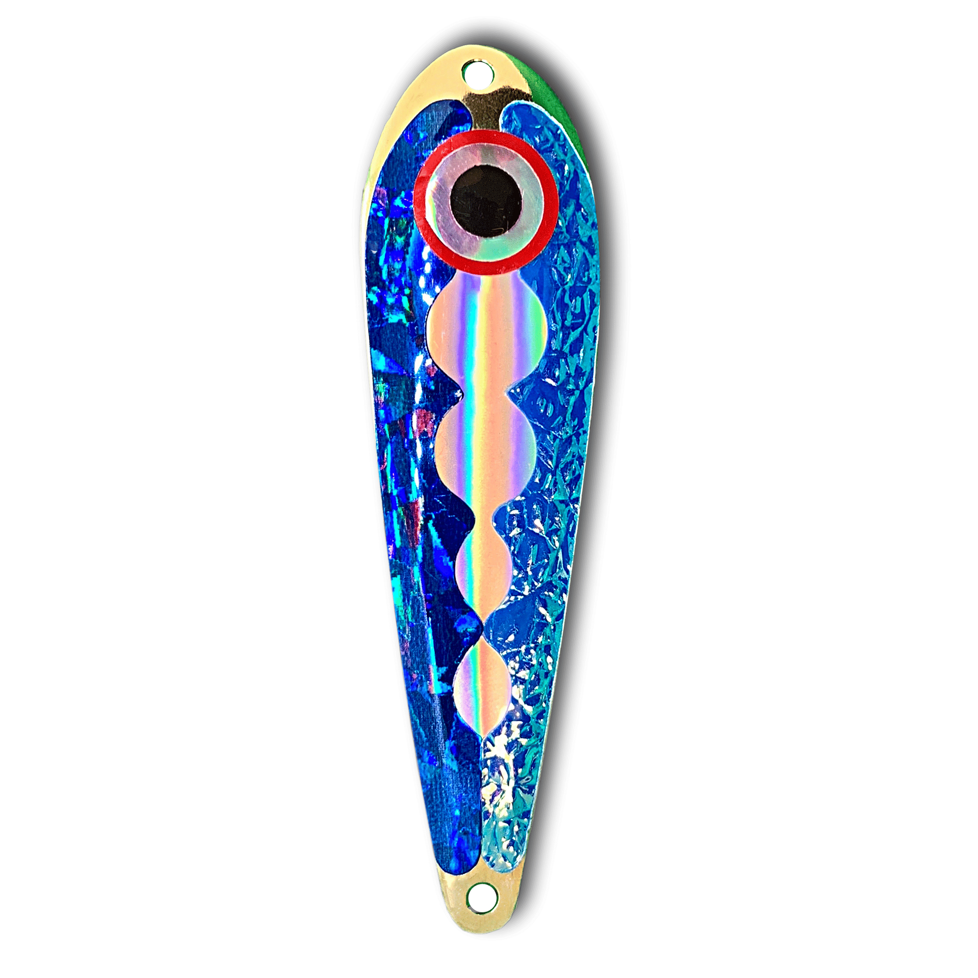 Clear coated brass, high performing, elongated teardrop-shaped spoons with top quality holographic, super glow and/or UV tapes in our hottest hitting colour combinations.