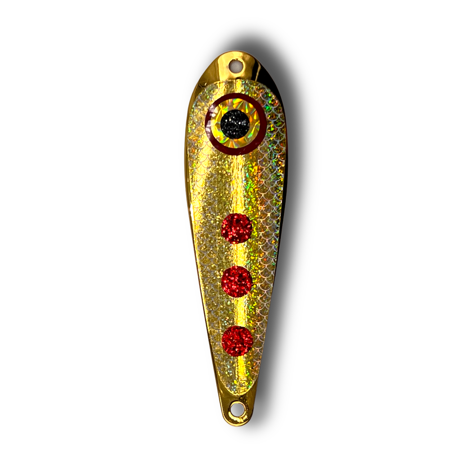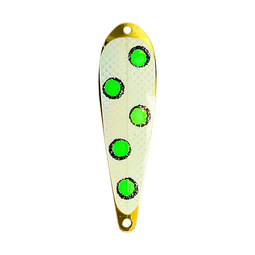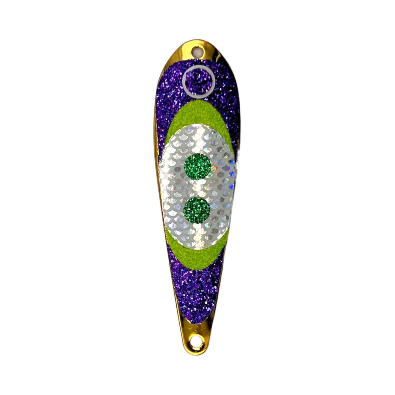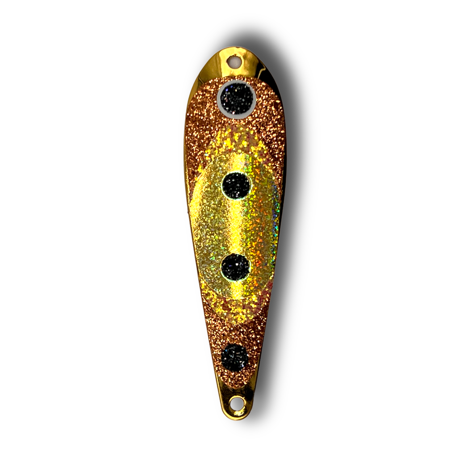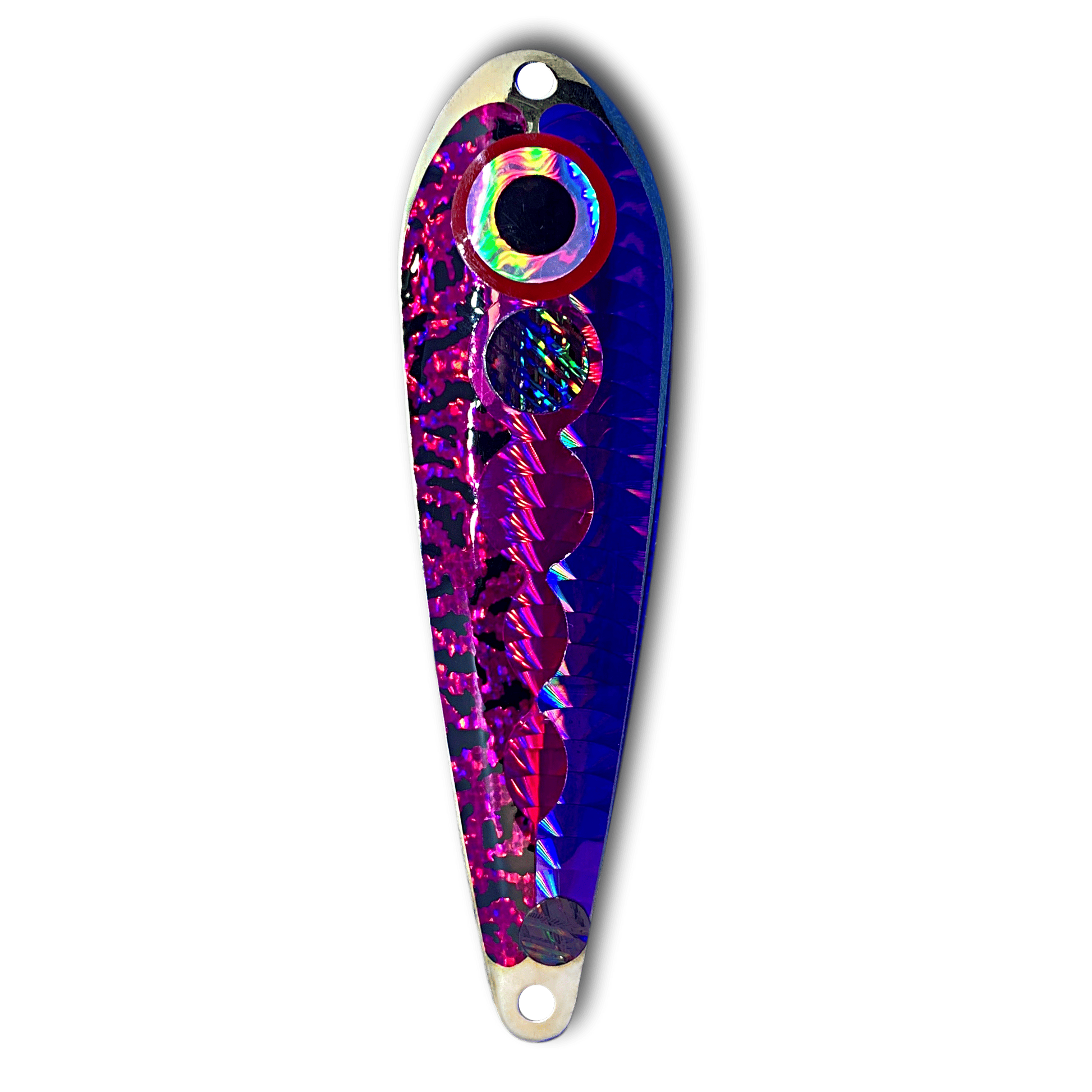Clear coated brass, high performing, elongated teardrop-shaped spoons with top quality holographic, super glow and/or UV tapes in our hottest hitting colour combinations.