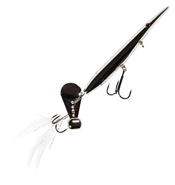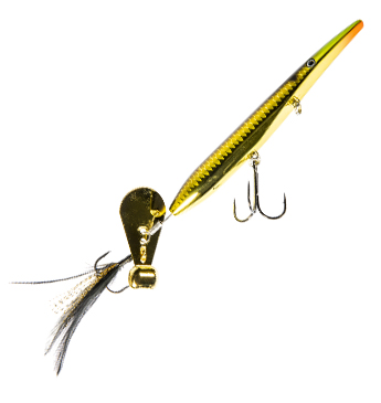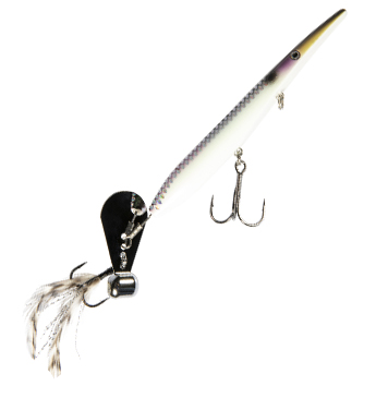 - Thin, elongated body, belly line tie, and weighted tail blade produce hard-cutting walking, spitting, and flashing action on straight retrieves